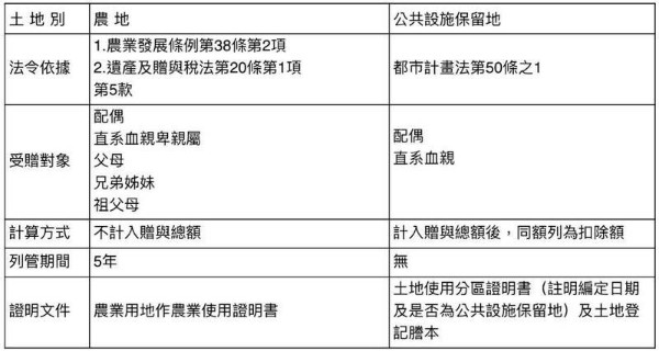 財政部高雄國稅局表示,政府給予公共設施保留地及農業用地租稅優惠,對於贈與公設地、農業用地及地上農作物,皆有免徵贈與稅規定,但兩者適用受贈對象與計算方式大不同,其中公設地適用免徵贈與稅的受贈對象限配偶及直系血親,農地則包括配偶、直系血親及兄弟姊妹。