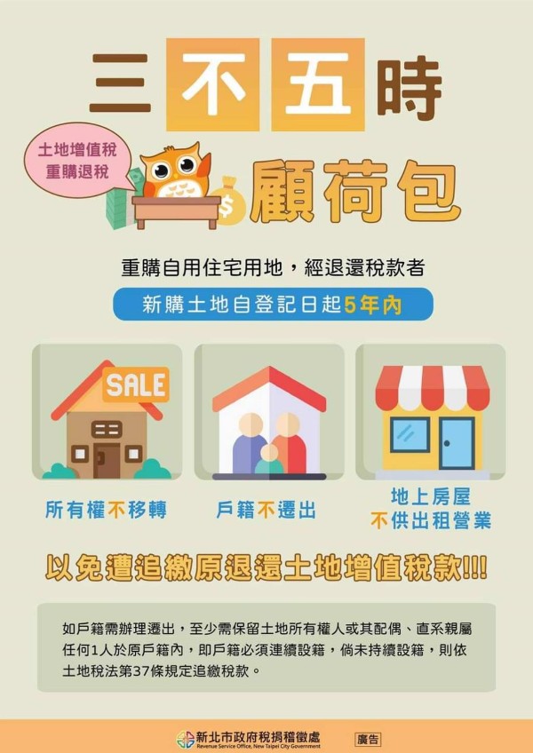 土地所有權人重購自用住宅用地可退還土地增值稅,不過重購的土地移轉登記後有5年列管期,新北市稅捐處納稅者權利保護官提醒,列管期內不得移轉所有權、不得遷出戶籍以及僅可自住不得出租營業,違反規定者將被追繳原退還稅款。