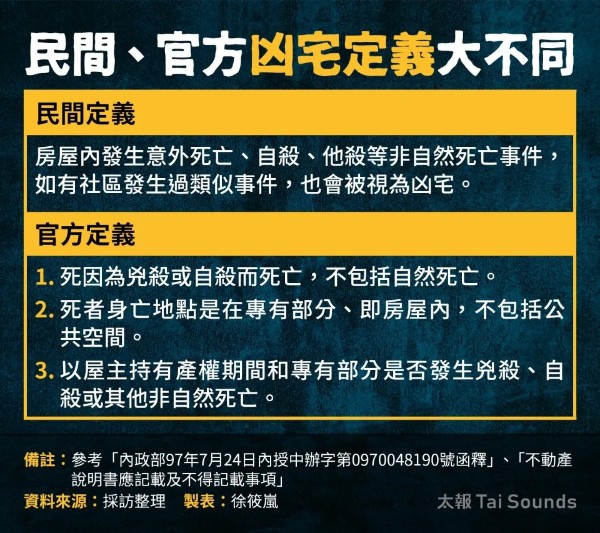 住展雜誌發言人陳炳辰說明,對一般民眾而言,只要房屋內發生過兇殺、自殺等非自然死亡事件,都會認定是凶宅;而官方目前對凶宅的定義,主要以內政部97年7月24日內授中辦字第0970048190號函釋,以及不動產說明書應記載及不得記載事項的定義為主。
